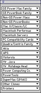 on 68K and PPC Macs. When GURU is launched it displays a floating palette like the one shown below. This palette is composed of a dozen and a half pop-up menus. Each pop-up represents a family, or group, of computers. To determine your next memory upgrade simply choose the family which contains the computer you are interested in. Click, and hold, on the pop-up family. A list will appear which contains all members of that family. Slide the mouse to the desired machine and release the button. You will immediately be presented with the main information screen. The screen shot below illustrates some of the configurations possible for the 7500/100. |